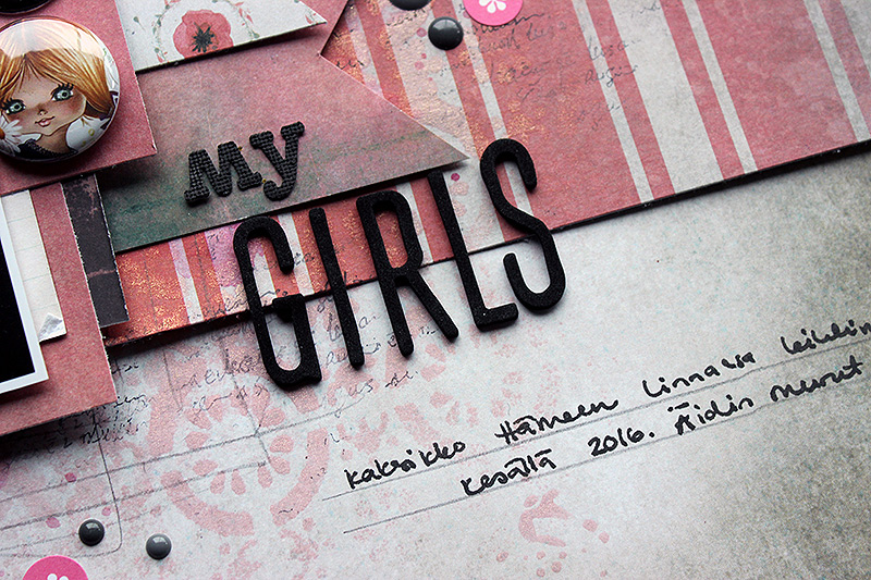 Riikka is a Finnish mixed media influenced crafter. She lives in Helsinki, the capital of Finland with her husband and two daughters. What she creates the most during a year is layouts, but she also enjoys tremendously creating altered pieces and canvases. You can find her from her blog, Paperiliitin, but also from other social media sources like Facebook, Instagram, Twitter and YouTube. I will add all the links after her layout if you would like to check out more of her work and follow her. Here is what Rikka had to say.