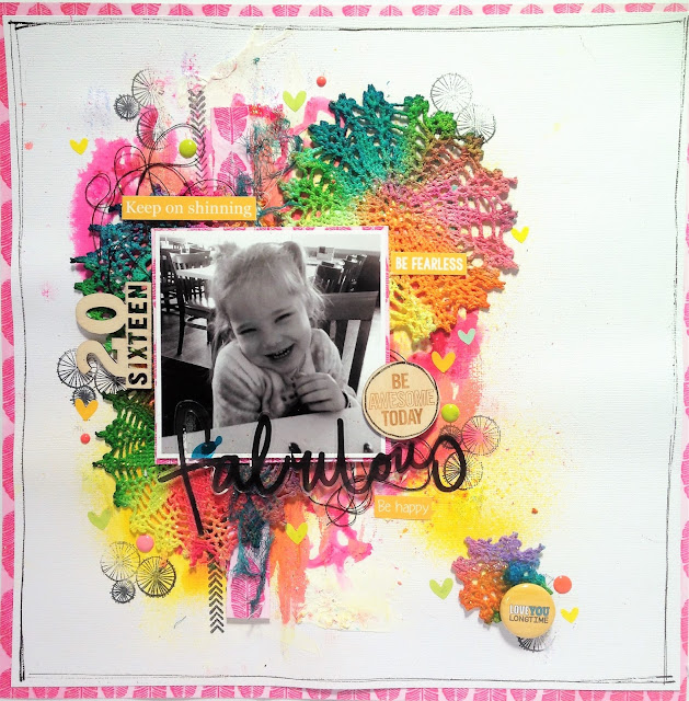 My style of crafting is what you would call messy! I love all forms of mixed media whether that be on scrapbook layouts, a canvas, cards or art journaling. I love stepping out of my comfort zone and getting my hands messy....I'm not truely happy unless my fingers are stained with glorious colours of inks and sprays!!!